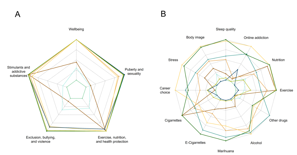 Figure 4Health issues addressed, stratified by school doctor. Proportion of consultations in which A) overarching health topics or B) specific subtopics were addressed (information on specific subtopics was only available for “well-being”, “exercise, nutrition and health prevention”, and “stimulants and addictive substances”). The innermost polygon represents 0% (addressed in zero consultations); the outmost polygon represents 100% (addressed in every consultation). The different colours represent different school doctors. Number of school doctors: n = 9.