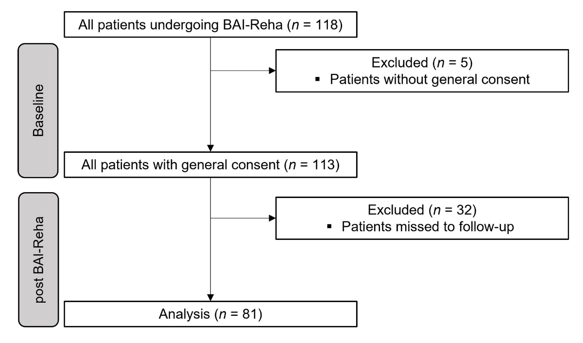 Since this is a registry-based study, there is no control group, and some data are missing. The data came from a clinical setting, and the outcome values of functional capacity had to be entered separately in the clinical documentation system and in the registry. Data may have been lost in the process, or patients may have refused to take certain measurements. Blinding of healthcare professionals and patients during interventions and functional capacity testing was not possible. Furthermore, the examiner was usually the physiotherapist treating the respective patient. This could result in the patient feeling pressured to perform better to increase treatment success. Also, one of the first authors is substantially involved in the BAI-Reha, as she is part of the intervention team and could therefore have certain biases or be routine-blinded (e.g., prioritisation of physiotherapeutic interventions and outcome variables). The time between baseline and postmeasurements varied with respect to the start of the BAI-Reha after the suitability assessment. Depending on the activity level of the patients and ongoing therapeutic interventions, the baseline measurements could have changed in the meantime.