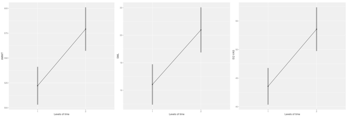 Table 3Change of mean value over time, averaged over the levels of sex, for the primary outcome variables six-minute-walk test (m), SML (kg), and EQ VAS.