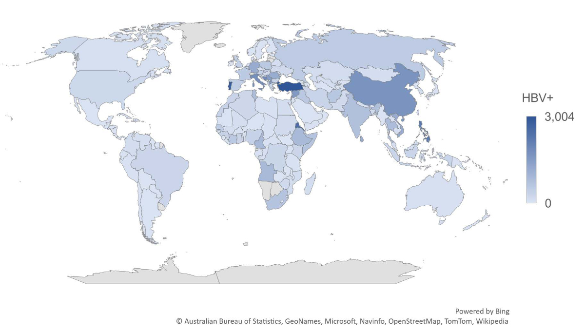 Figure 1Map of foreign-born HBV cases by country of birth (excl. Switzerland) + Swiss Residents, 2020.