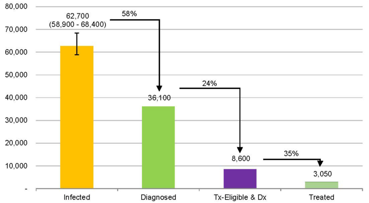 Tx All – Curr Guide: By increasing diagnosis and linkage to care so that 80% of individuals eligible for treatment receive treatment, there would be an estimated 65% reduction in the incidence of decompensated cirrhosis (from 48 [42–58] in 2020 to 17 [11–26] in 2030), a 4% increase in the incidence of hepatocellular carcinoma (from 173 [162–211] in 2020 to 180 [131–353] in 2030) and a 3% increase in liver-related deaths (from 198 [178–241] in 2020 to 203 [163–349] in 2030] by 2030. Compared to the Base Case, this scenario would prevent 100 cases of decompensated cirrhosis, 120 cases of hepatocellular carcinoma and save 120 lives.
