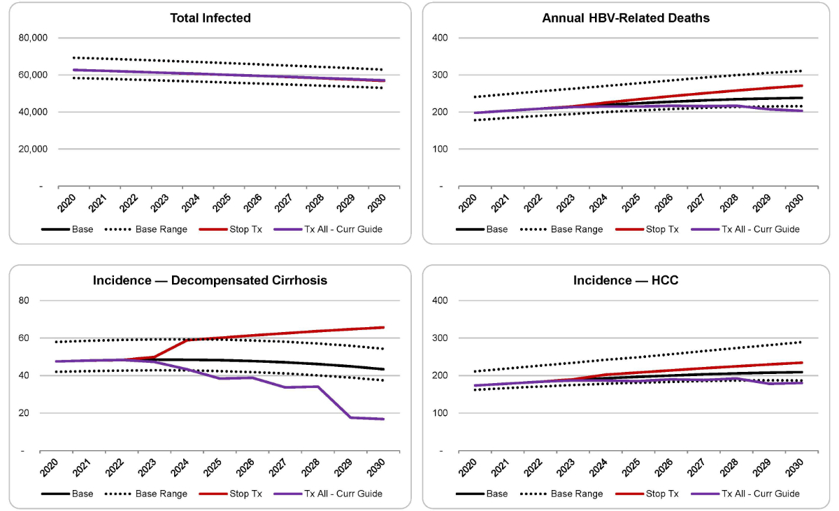Stop Tx: If all treatments were stopped in 2022, there would be an estimated 38% increase in the incidence of decompensated cirrhosis (from 48 [42–58] in 2020 to 66 [58–78] in 2030), a 35% increase in the incidence of hepatocellular carcinoma (from 173 [162–211] in 2020 to 234 [216–266] in 2030) and a 37% increase in liver-related deaths (from 198 [178–241] in 2020 to 271 [242–314] in 2030) by 2030. Compared to the Base Case, this scenario would result in an additional 110 cases of decompensated cirrhosis, 120 cases of hepatocellular carcinoma and an additional 140 lives lost.