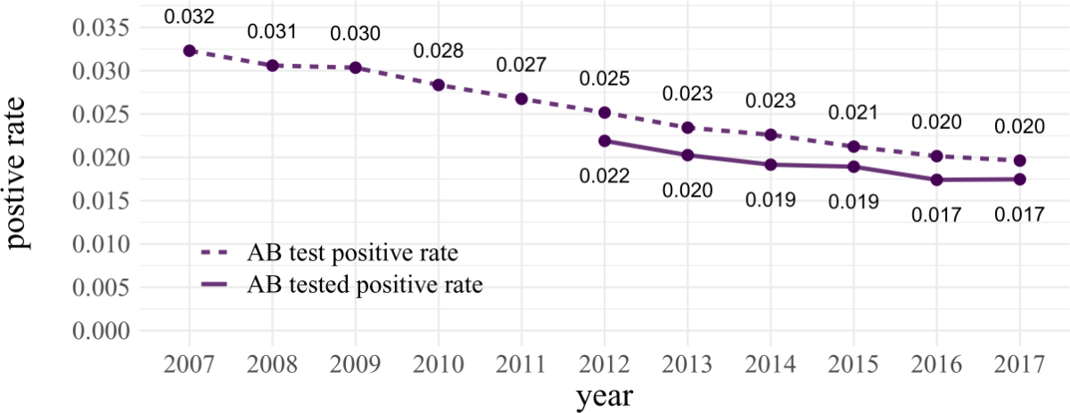 Moreover, the decreasing antibody positive rates could also be due to a decreasing number of untested HCV antibody-positive people in the population. To verify this hypothesis, it would be necessary to know in which populations testing rates have increased.