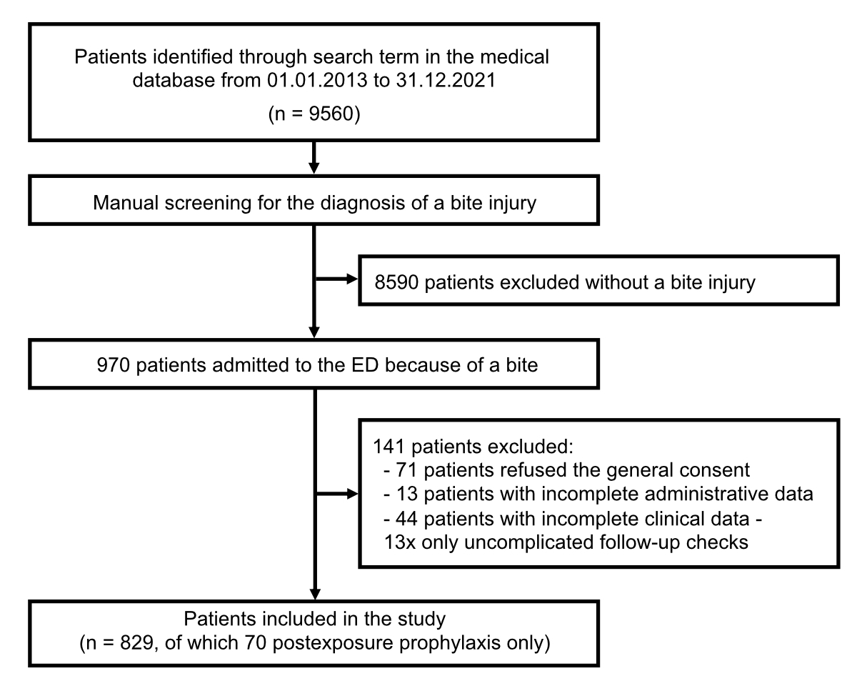 A full-text keyword search was performed on the medical reports of all adult patients (≥16 years) admitted to our emergency department within the given time period using the defined keyword “bite”. The medical reports of the identified consultations were then manually reviewed for an actual human or animal bite injury by two experienced physicians (MK and LM). Patients without a recent bite wound diagnosis, cases with incomplete clinical data in the manual full-text analysis and patients who refused to give general consent for the use of their anonymised data or subsequently withdrew it were excluded from the study. Follow-up consultations after the emergency department visit were not evaluated. Patients who visited the emergency department only for postexposure prophylaxis were analysed separately (postexposure prophylaxis-specific) due to often undocumented bite information in the reports.
