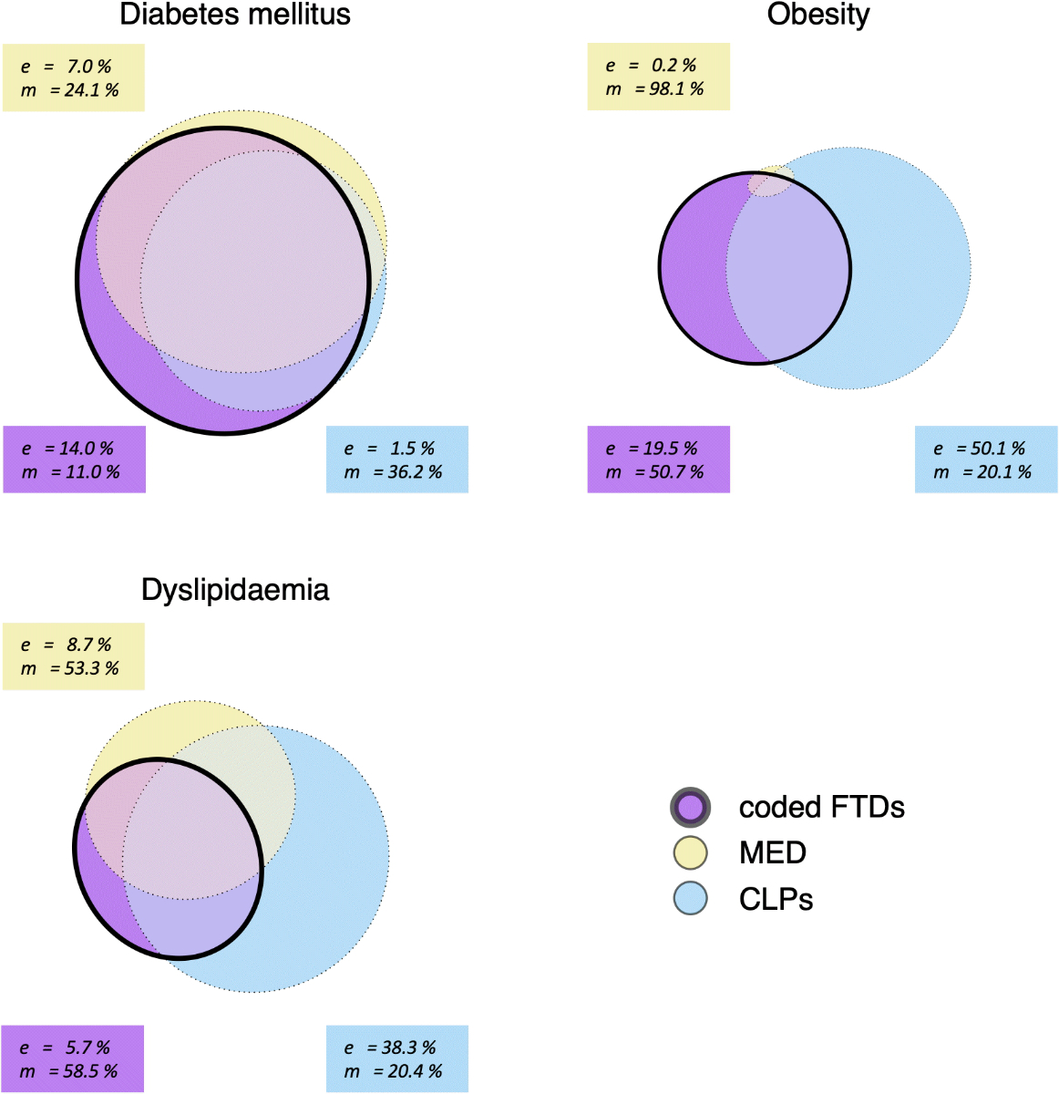 Figure 1Exclusive and missed cases identified by individual EMR components for each target disease, displayed as approximately area-proportional Euler diagrams. The areas represent the number of cases identified by each EMR component. Abbreviations: coded FTDs, coded free-text diagnoses; MED, medication data; CLPs, clinical and laboratory parameters; e, proportion of total disease prevalence identified exclusively by the respective EMR component; m, proportion of total disease prevalence missed by the respective EMR component.