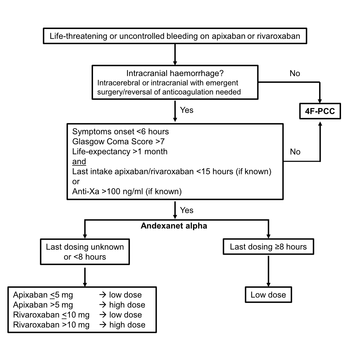 | Recommended: andexanet alfa | Recommended: aPCC, 4F-PCC, rFVIIa, 3F-PCC | |