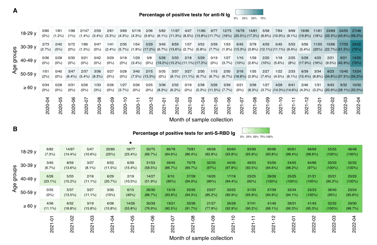 Figure 3Serological responses by age group over time. The proportions (positive tests / total tests) and percentages of positive tests for anti-N Ig (A) and anti-S-RBD Ig (B) were calculated for each month and age group and are shown on a colour scale where light or dark hues correspond to lower or higher percentages, respectively. Samples were classified as positive if the anti-N Ig level was ≥1.0 COI and the anti-S-RBD Ig was ≥0.8 U/ml. The asterisk denotes the month where a significant difference was found between age groups (Fisher’s exact test with a Benjamini and Hochberg correction for multiple comparisons; padjusted <0.0451). COI: cut-off index; anti-S-RBD: anti-SARS-CoV-2 spike glycoprotein receptor binding domain.