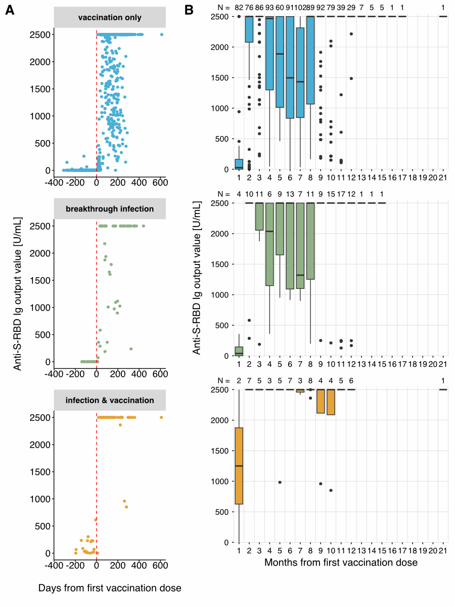 Next, we binned all measurements by donor and month after their respective first vaccination date (figure 5B). As noted above, the vaccination-only and post-vaccine breakthrough infection groups showed similar anti-S-RBD Ig courses over time. The median anti-S-RBD Ig output values were very low within a month of the first vaccination dose (≈ 30 U/ml) and then steeply increased within two to three months. After a decrease in output values by four months, especially in the vaccination-only group, a second steep increase was observed from eight months onwards. In contrast, in the infection before vaccination group, the anti-S-RBD Ig output values were already elevated within one month of the first vaccination dose, and the median did not decrease over time. However, this group had a small sample size (nmax = 8).