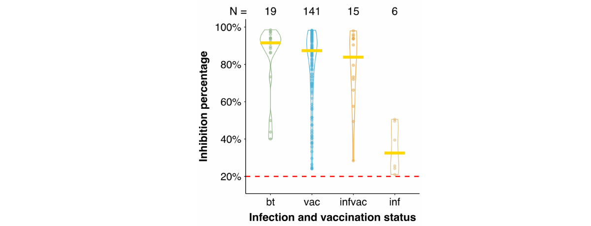 Figure S3Inhibition percentages grouped by infection and vaccination status. Samples (dots) with an inhibition percentage measured by the surrogate virus neutralisation test (sVNT) and the infection and vaccination status determined by the questionnaire responses were included. The areas around the dots represent the distribution density, the yellow line denotes the median, and the red dashed line denotes the cut-off of the sVNT at 20% inhibition. The values above the violin plots represent the number of samples included in the calculations for each category. bt: post-vaccine breakthrough infection; vac: vaccination only; infvac: infection before vaccination; inf: natural infection only.