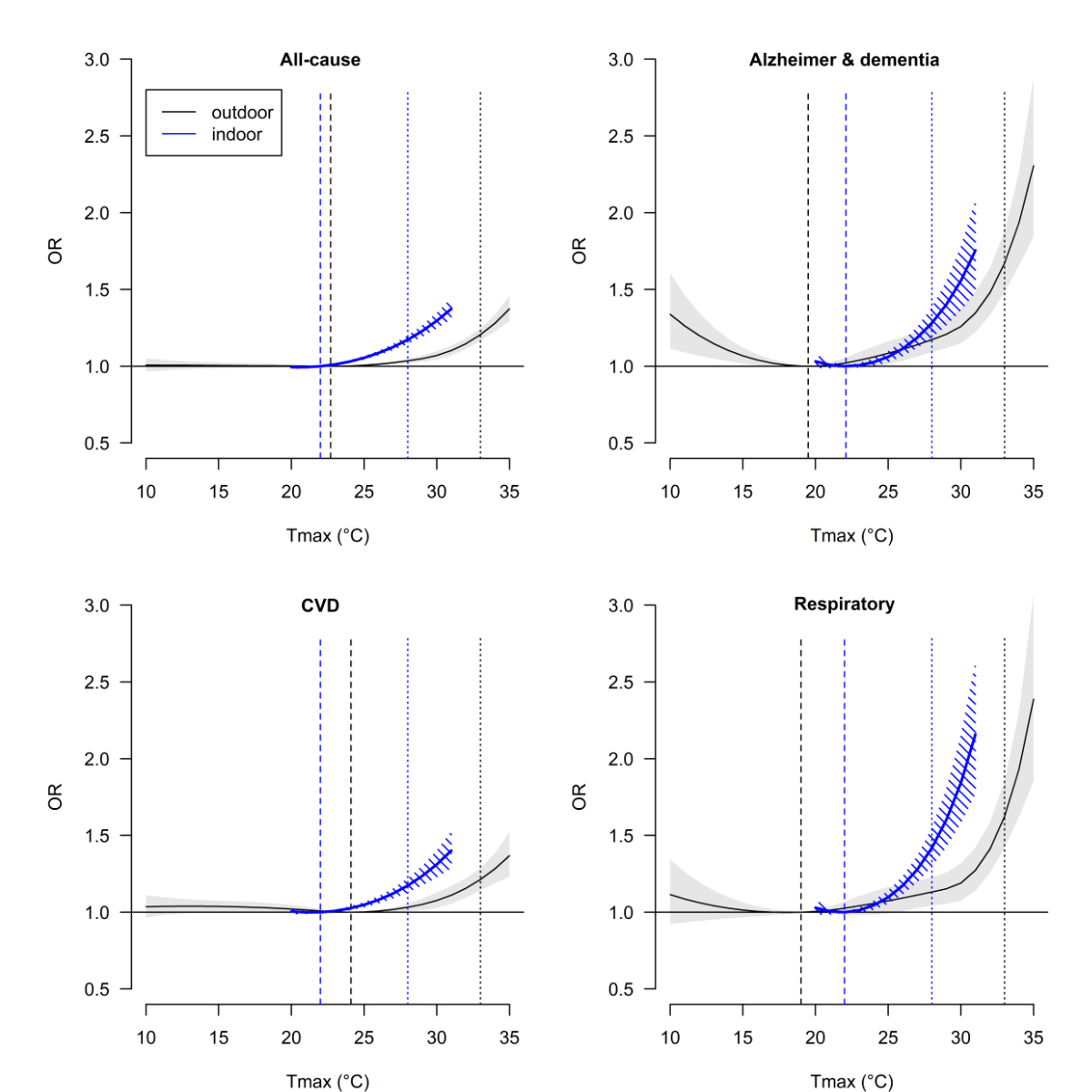 Comparison of outdoor (black curve) and indoor (blue curve) temperature-mortality associations (with 95% confidence intervals) for specific mortality causes in Switzerland during the warm seasons of 2003–2016. Odds ratios (ORs) represent the change in mortality risk associated with outdoor and indoor daily maximum temperature (Tmax) versus the cause-specific minimum mortality temperature (dashed vertical lines). Dotted vertical lines mark the 98th percentile of the warm season Tmax.