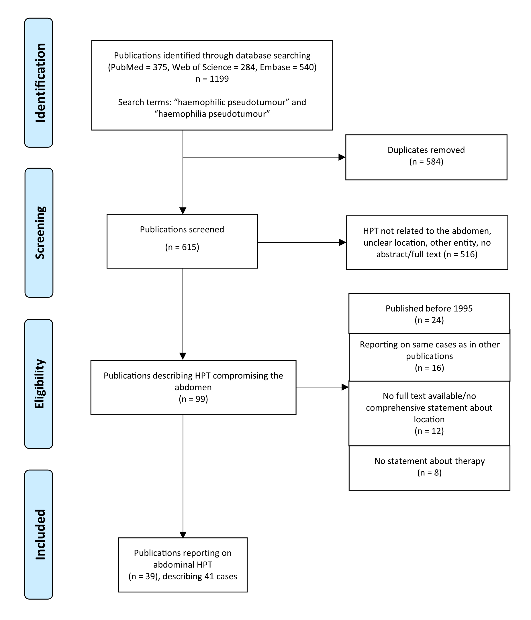 The data search in the three electronic databases using the defined terms extracted 1199 potential articles. After removing 584 duplicates, the titles and abstracts were screened for eligibility. Consequently, 516 articles were excluded due to an unclear or extraabdominal location of the reported haemophilic pseudotumour or for other blood cyst entities than haemophilia. The remaining 99 articles documented abdominal haemophilic pseudotumour with intraperitoneal or extraperitoneal location, the latter with contact to the abdomen by compressing or displacing abdominal organs. Twelve were excluded because of missing full texts or incomplete information regarding location. Eight articles were removed due to missing statements about therapy management. Another 16 articles reported the same cases as other already included publications and were therefore removed. Twenty-four articles were excluded due to publication before 1995. Eventually, 39 relevant articles published between 1995 and 2023 involving 41 cases were included in the final analysis (fig. 1).