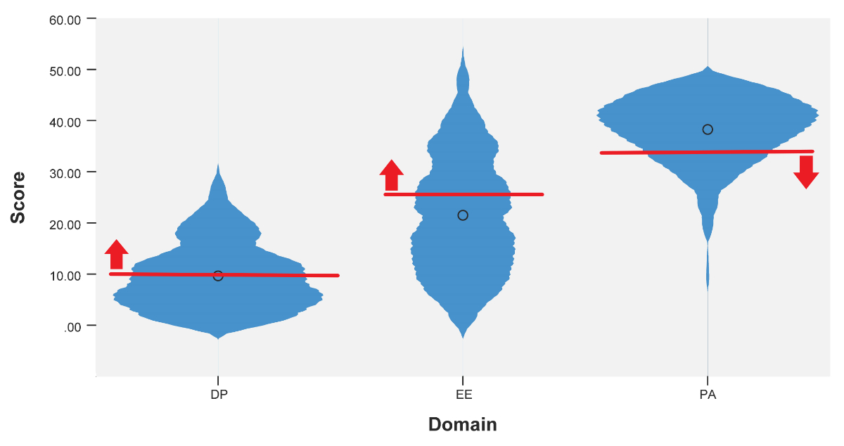 Figure 1Violin plot. Total score by domain of the Maslach Burnout Inventory (0 = mean score). Red lines indicate the cut-offs for each Maslach Burnout Inventory domain, with the red arrows indicating those above each threshold. Black circles indicate median scores.