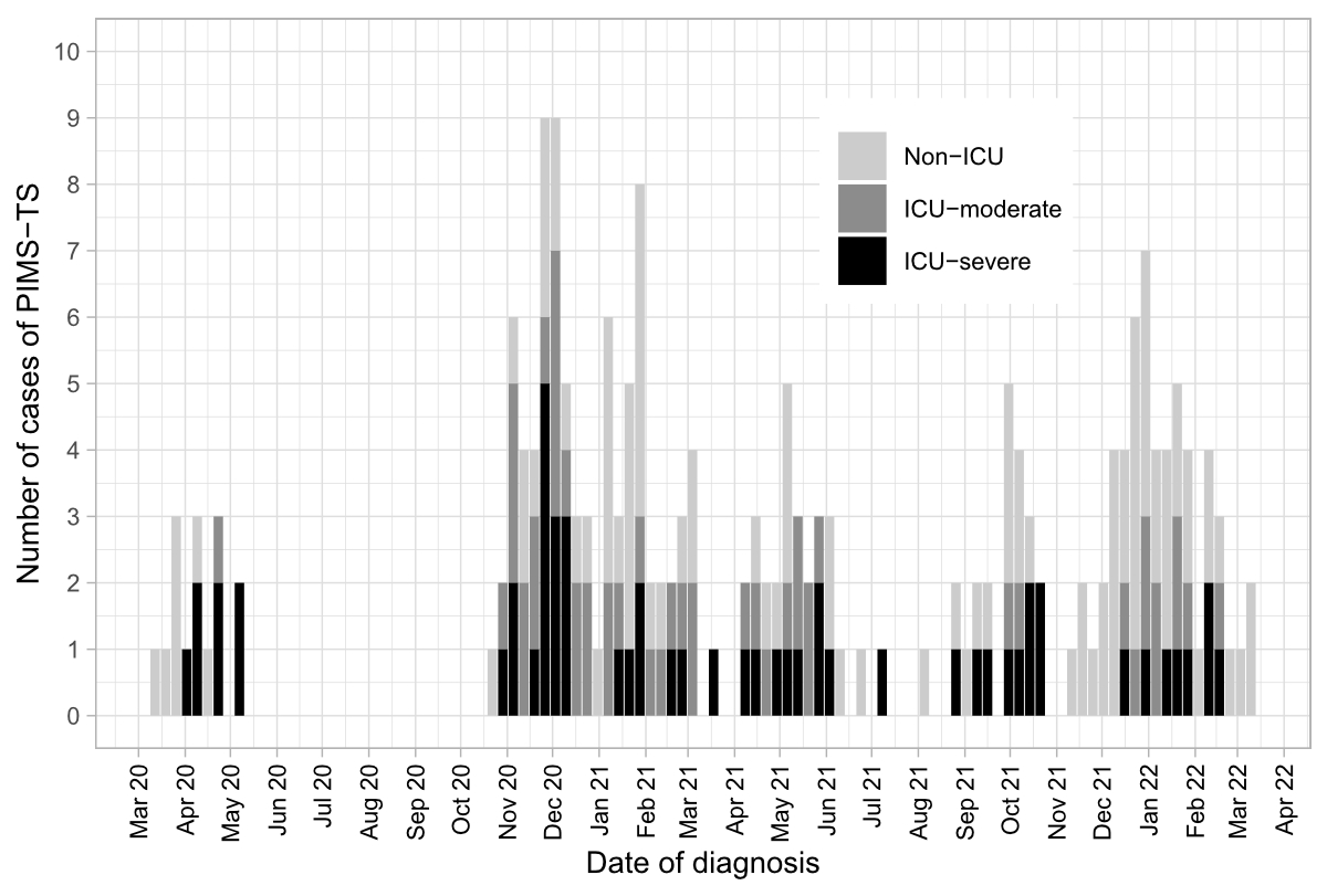 Figure 1Number of children with PIMS-TS according to ICU admission over time.