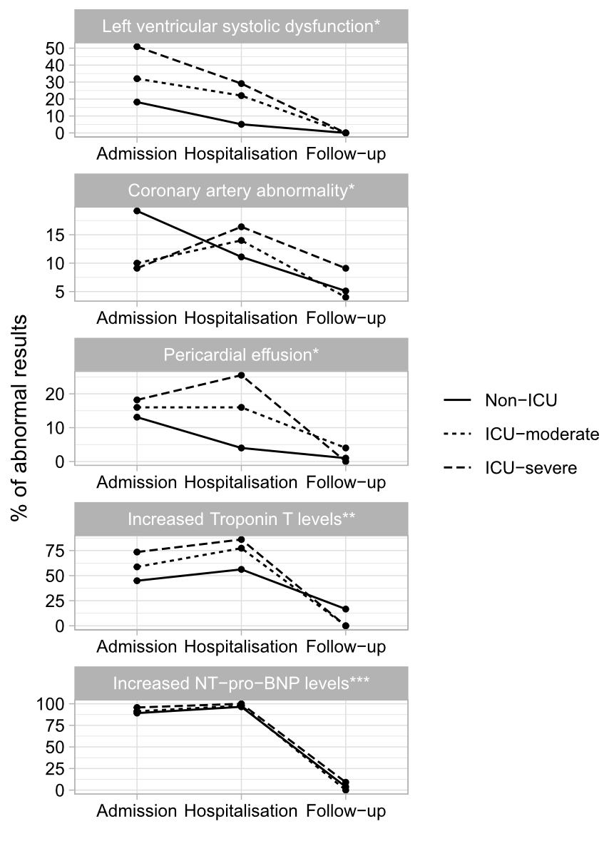 Figure 3Summary of echocardiographic and laboratory findings during admission, hospitalisation and follow-up according to disease severity. (Non-ICU: child not admitted to the ICU; ICU-moderate: child admitted to the ICU without need for mechanical ventilation and/or inotropic support; ICU-severe: child admitted to the ICU with need for mechanical ventilation and/or inotropic support.)