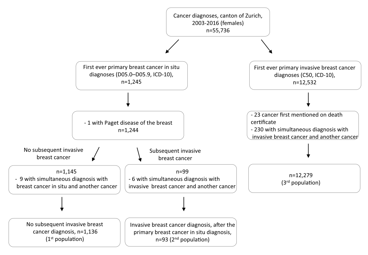 A schematic presentation of the study populations is shown in figure 1. The first population of interest included women whose first ever cancer diagnosis was primary breast carcinoma in situ (D05.0 to D05.9 in International Classification of Diseases 10th edition [ICD-10]) who did not develop primary invasive breast cancer (C50 in ICD-10) during the study period (2003–2016; n = 1136). From this population of interest were excluded: women diagnosed with another type of cancer before breast carcinoma in situ; women diagnosed with Paget disease of the breast; and women in whom another cancer (including invasive breast cancer) was diagnosed at the same time as breast carcinoma in situ (i.e. with the same cancer incidence date). The first study population consisted of women who did not develop primary invasive breast cancer (C50 in ICD-10) during the study period. Women with primary breast carcinoma in situ who met the aforementioned inclusion criteria and who later, during the study period, developed primary invasive breast cancer were considered the second population of interest (n = 93).