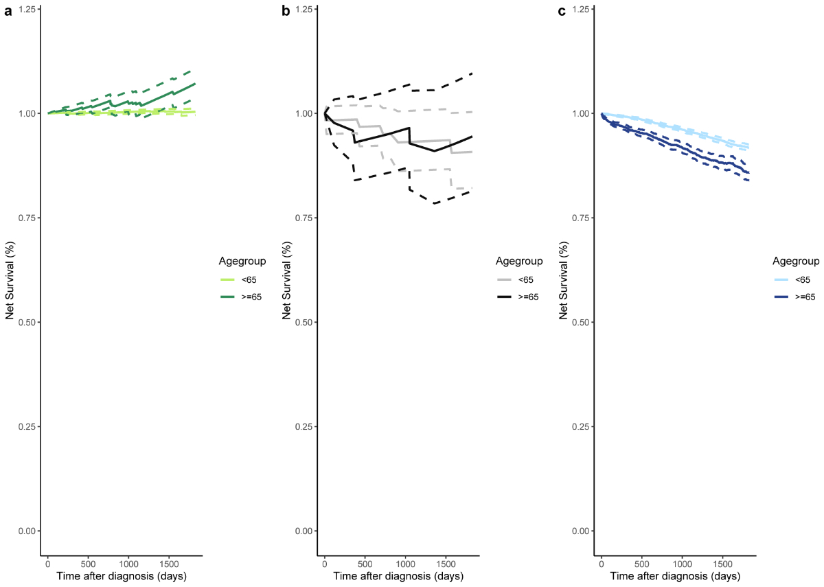 Figure 35-year net survival according to age at cancer diagnosis and cancer type: (a) In situ breast cancer (n<65 = 830, n≥65 = 306); (b) Invasive breast cancer preceded by a recorded in situ breast cancer (n<65 = 58, n≥65 = 35); (c) Invasive breast cancer not preceded by a recorded in situ breast cancer (n<65 = 6889, n≥65 = 5390). The dotted lines represent the estimated 95% confidence interval for each study population and age group.