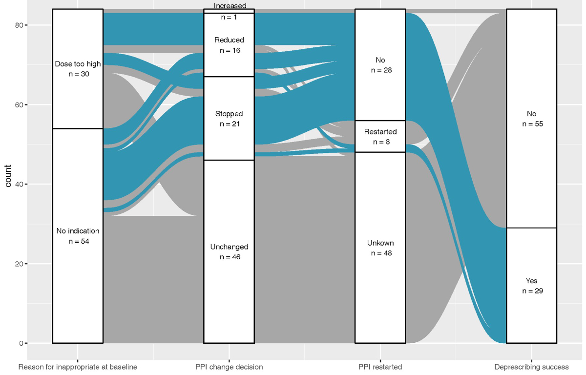 Figure 2Alluvial diagram illustrating the participant flow according to proton-pump inhibitor prescription and successful deprescribing (n = 84).