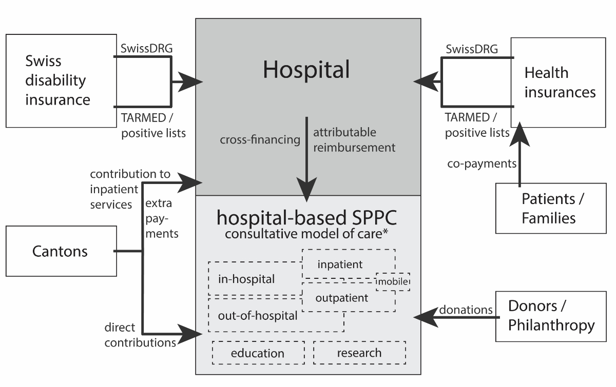Figure 1Conceptualisation of direct financial flows and funding arrangements regarding hospital-based consultative specialised paediatric palliative care programmes in Switzerland. * The consultative model of care refers to the provision of medical treatment, care coordination, psychosocial support and other consultative services that contribute to primary care provision. Care and support is provided to families, primary care teams and other professionals in and out of hospitals, i.e. inpatient, outpatient/mobile services. Specialised paediatric palliative care teams may engage in paediatric palliative care-related research and education.