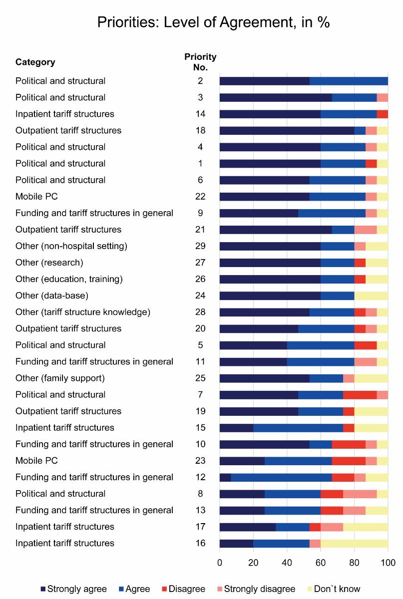 A level of agreement >70% was measured for 22 of the 29 identified priorities. Three priorities had consensus rates of >90%: “The development of financing solutions to ensure the long-term funding of specialised paediatric palliative care programmes”, “The provision of funding and support for integrated palliative care programmes” and “Sufficient reimbursement of inpatient service costs in the context of high-deficit palliative care cases”. Zero disagreement was recorded for two priorities: “Establishing a valid nationwide database on palliative care provision and offering funding and support for integrated palliative care programmes, well-performing treatment pathways” and “Closer cooperation and coordination among service providers”. The distribution of agreement levels of identified priorities is shown in figure 3.