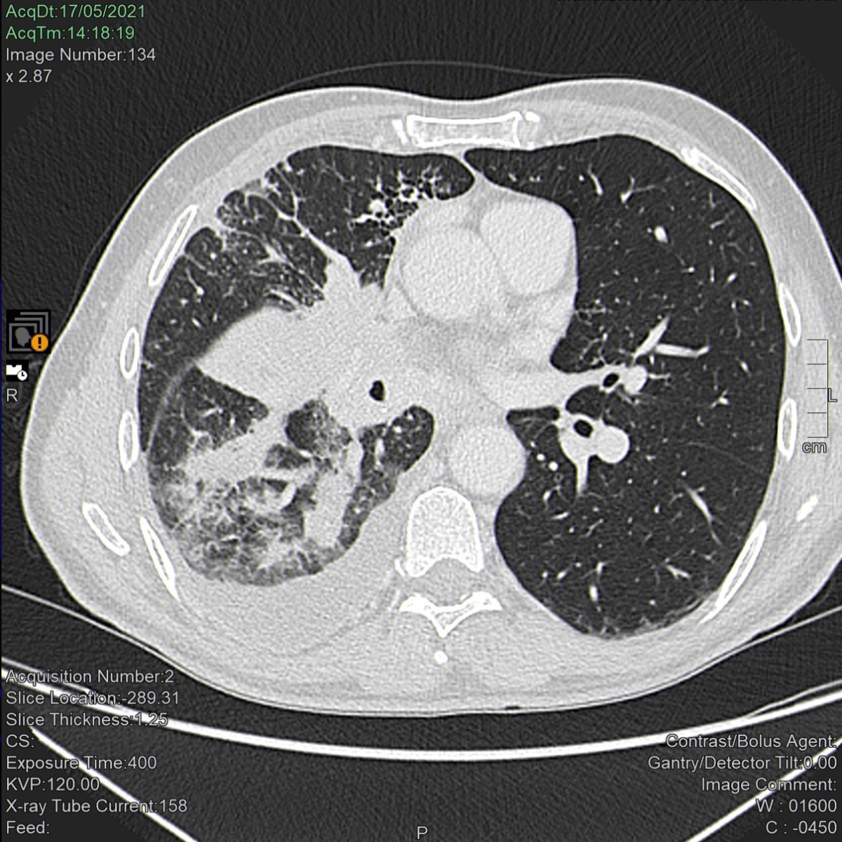 Figure 1Computed tomography scan of the lungs before treatment with pembrolizumab. A neoplastic mass occupies the right hilum causing complete stenosis of both the middle lobar bronchus (with complete atelectasis of the middle lobe) and the segmental apical bronchus of the lower right lobe. The lower lobar bronchus is reduced in size, parenchymal localizations are visible in the lower lobe and lymphangitis is apparent in the upper lobe. Pleural effusion is also apparent.