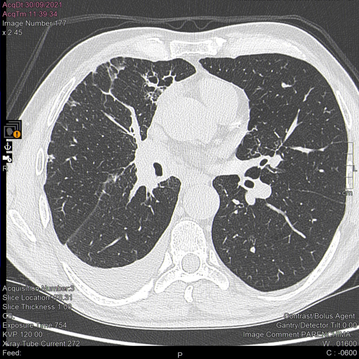 Figure 2Computed tomography scan of the lungs after 3 months of treatment with pembrolizumab. A considerable reduction in the size of the hilar tissue is apparent 3 months after pembrolizumab initiation. The middle lobe has re-expanded and the apical segmental bronchus of the lower lobe is newly patent. Parenchymal localizations have disappeared from the lower lobe and upper lobe lymphangitis has lessened.