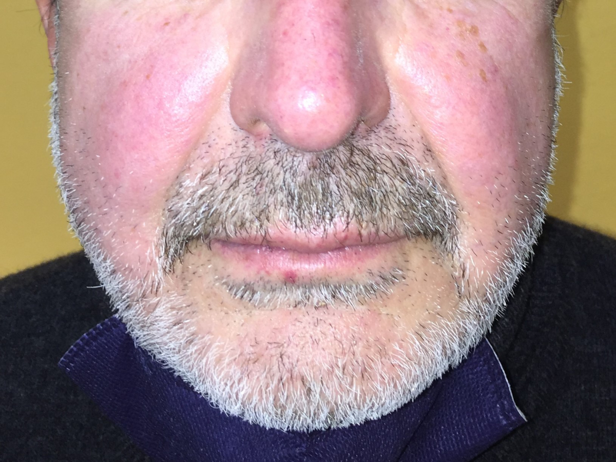 Figure 3Heliotrope rash: bilateral lilac discolouration of the cheeks and nasal bridge, and telangiectasias on the nose and lower lip.