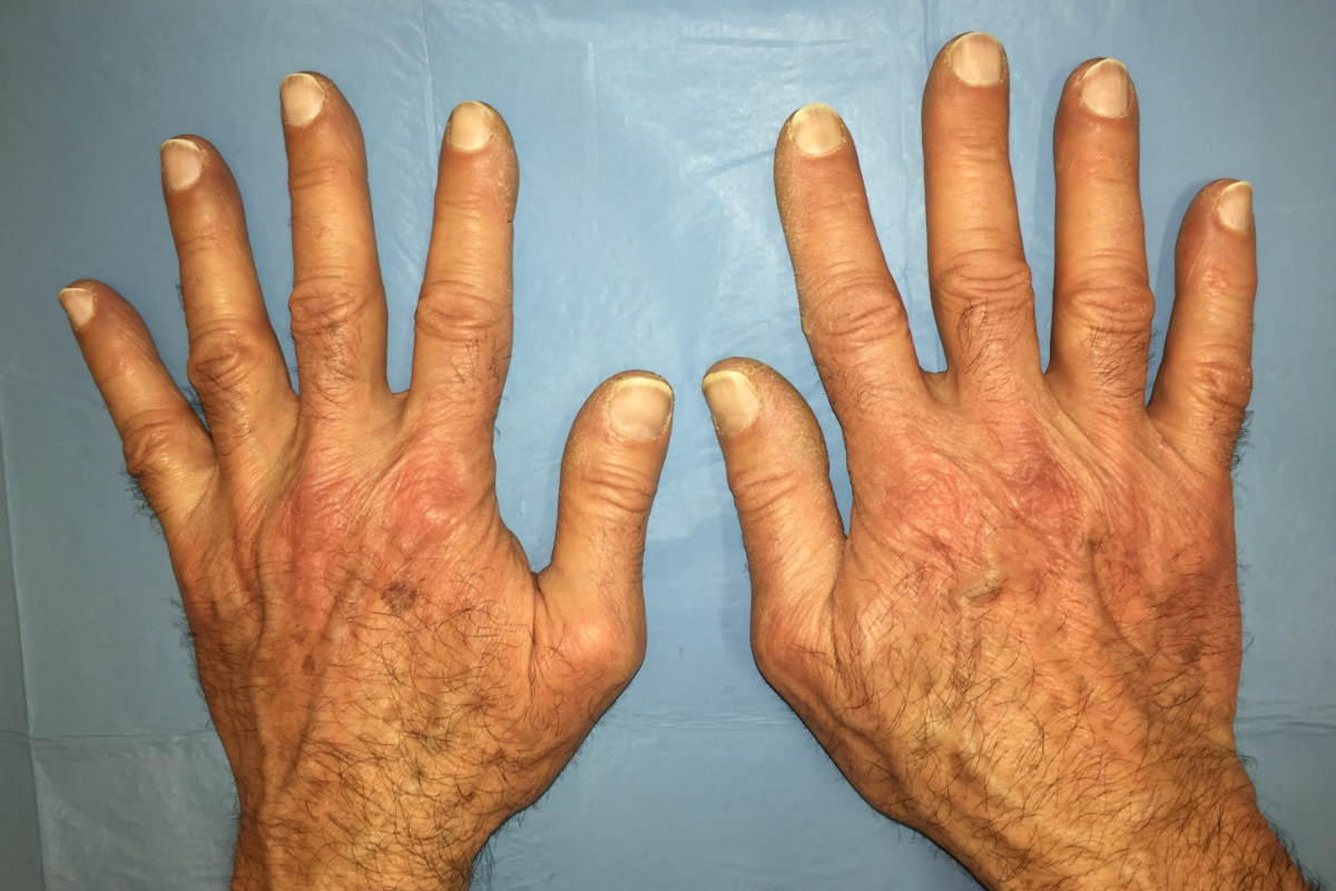 Electroneuromyography of all four limbs showed mild myogenic findings in the proximal upper limbs without signs of myositis and mild sensory-motor neuropathy in the lower limbs. Skin findings included a heliotrope rash on the eyelids, nasal bridge and cheeks (figure 3), Gottron’s sign on the backs of both hands (figure 4) and the left elbow, and mechanic’s hands (figure 5). Muscle strength was reduced, and manual muscle testing found tenderness on abduction of the upper limbs. Auscultation revealed decreased breath sounds without crepitations. A diagnosis of anti-MDA5-positive pauci-myopathic dermatomyositis was made. Systemic autoimmune diseases that develop following immune checkpoint inhibitor treatment and have potentially life-threatening consequences are classified as grade IV according to the CTCAE scale and require urgent intervention. Respiratory function tests revealed moderate non-reversible severe obstructive disease, alveolar hyperinflation and a moderate reduction of the lungs’ diffusing capacity for carbon monoxide. High-resolution computed tomography of the chest showed very limited signs of smoking-related interstitial fibrosis.