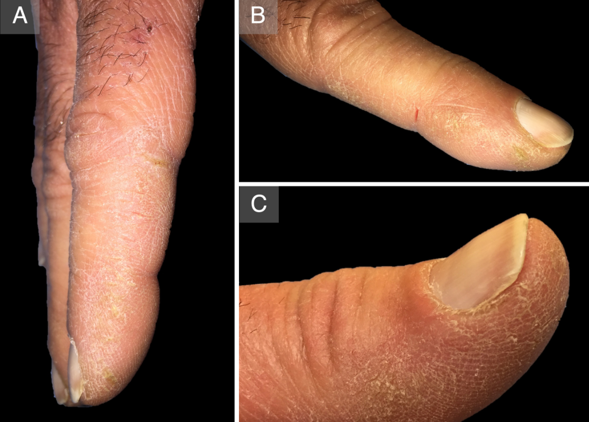 Figure 5Mechanic’s hands. A: Hyperkeratosis on the distal and lateral aspects of the index finger of the right hand. B: A fissure on the lateral side of the index finger of the left hand. C: Detail of the hyperkeratosis on the medial aspect of the thumb of the right hand.
