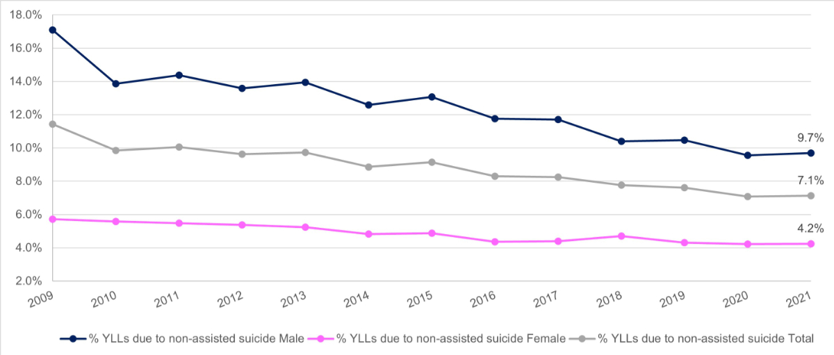 Overall, non-assisted suicides accounted for 1.4% of all deaths in Switzerland in 2021. In terms of YLLs however, suicide contributes 6.4% to annual years of life lost. This is a significant decrease from the 11.4% contribution reported for the year 2009.