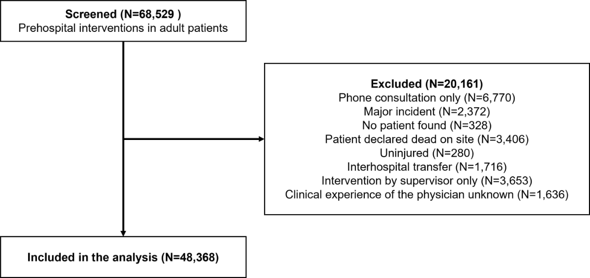 During the research period, 68,529 prehospital interventions involving adult patients were performed (figure 1). A total of 20,161 interventions were excluded. The three main reasons for exclusion were phone consultations (n = 6770), interventions performed by supervisors alone (n = 3653) and interventions in which patients were declared dead at scene (n = 3406). Hence 48,368 interventions were included in the analysis.