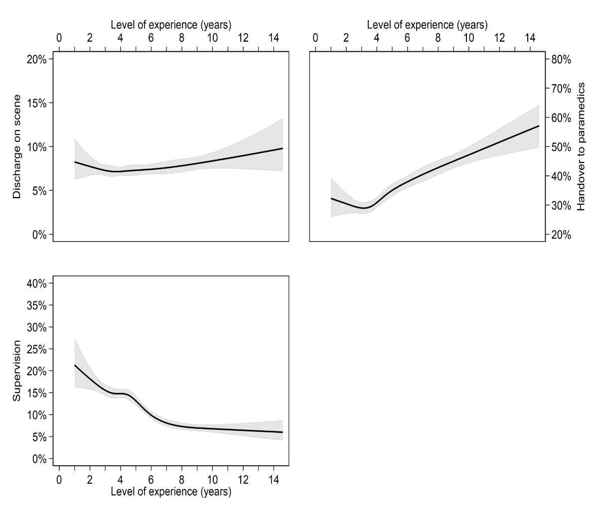 The associations are graphically presented in figure 2. Discharge at scene and handover to paramedics seem to increase with experience while supervision seems to decrease.