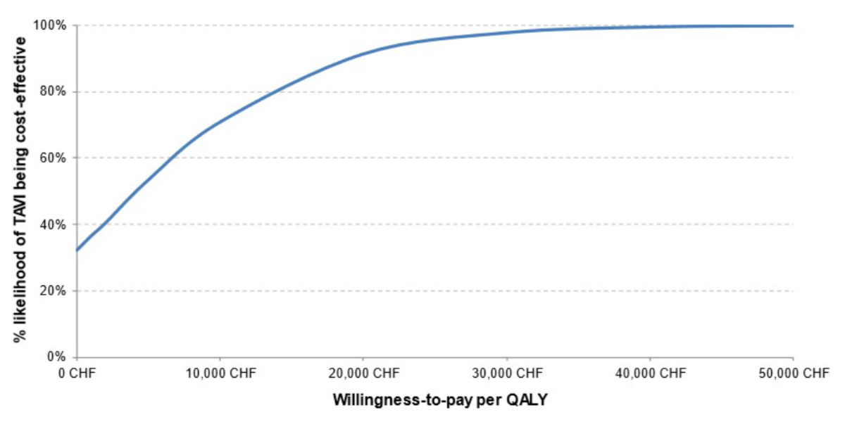 Figure 4Probabilistic sensitivity analysis: Cost-effectiveness acceptability curve. CHF: Swiss franc; QALYs: quality-adjusted life years; TAVI: transcatheter aortic valve implantation.