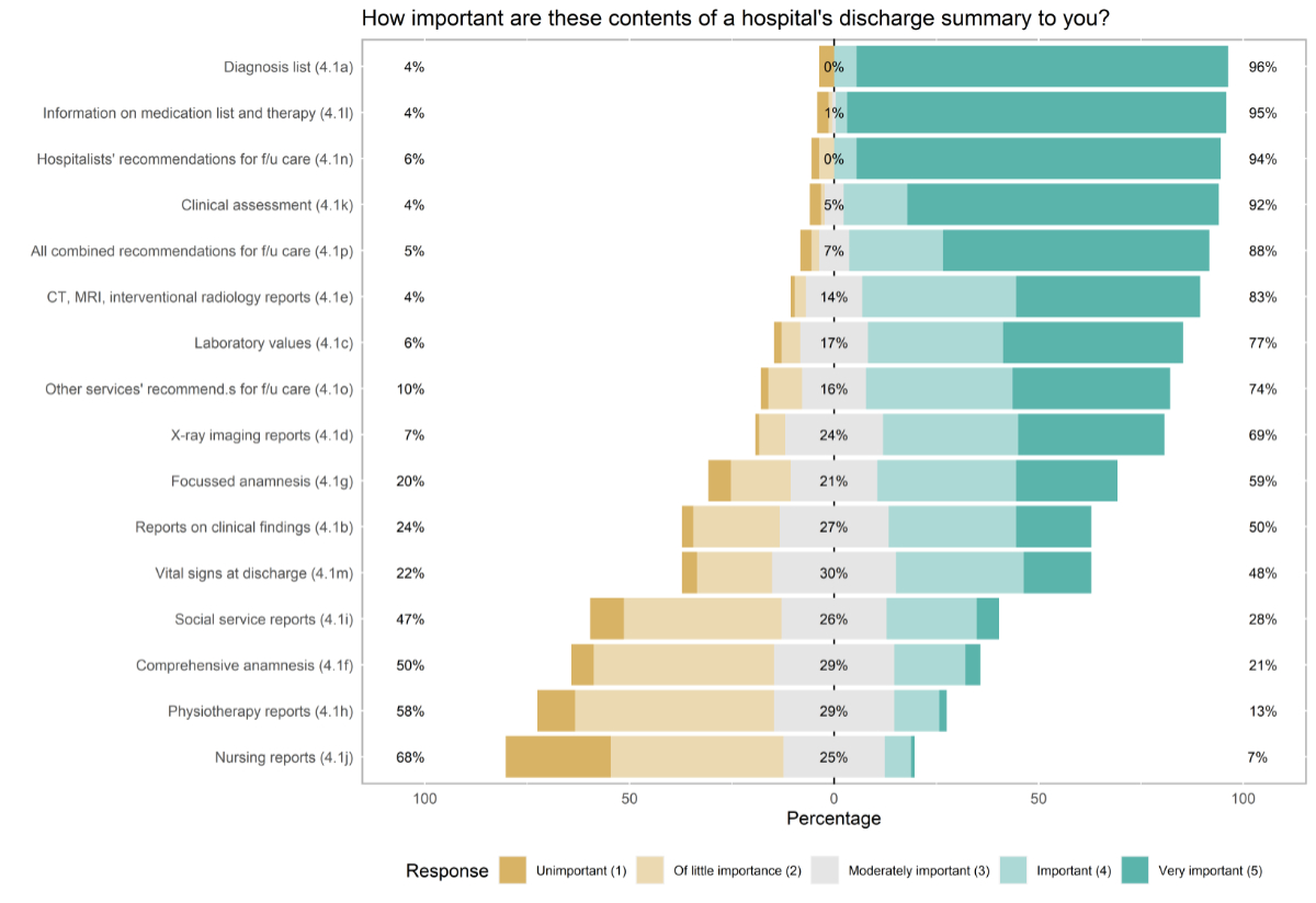 A total of 55% of primary care physicians reported that they preferred to receive an admission report within 48 hours of a patient’s admission, and 88% of primary care physicians reported that they preferred to receive a discharge report within 48 hours of discharge. After discharge, 33% of primary care physicians perceived that they were always or often informed by the hospital about a patient’s hospitalisation. Figure 1 depicts which content is most relevant to primary care physicians in discharge summaries.