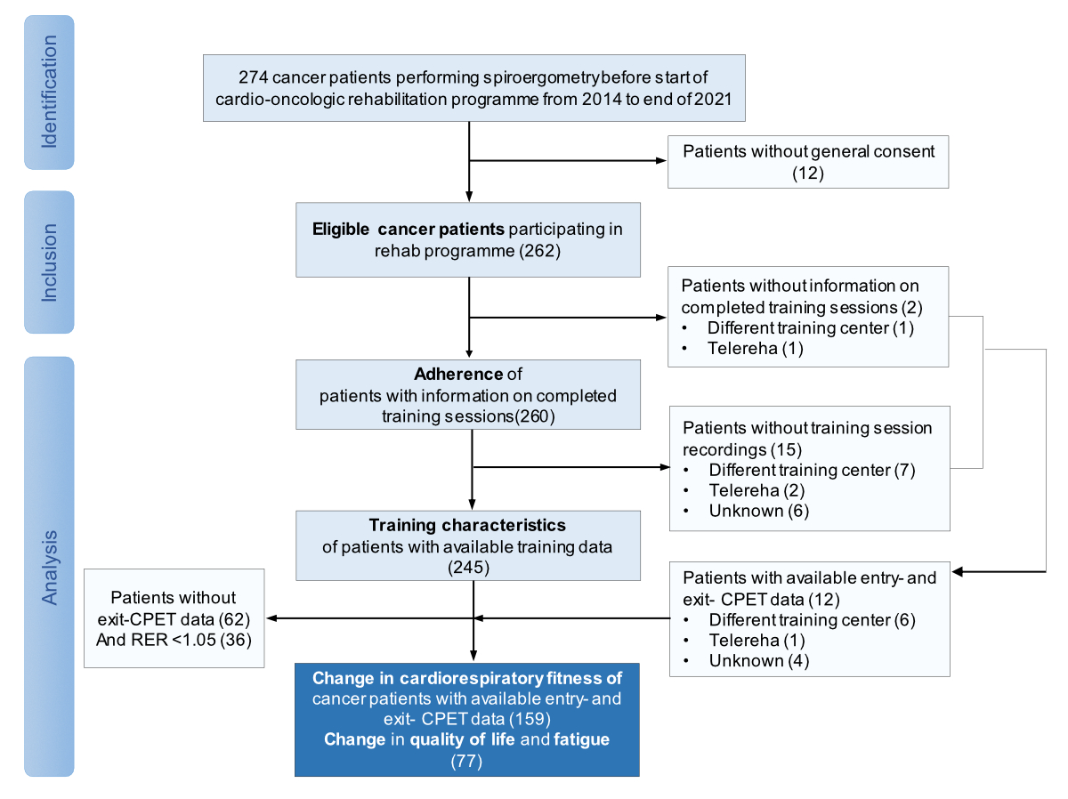 We included patients with cancer who participated in a 3-month exercise-based CORE programme at the University Hospital of Bern, Switzerland, between January 2014 and the end of January 2022 and who underwent a cardiopulmonary exercise test (CPET) at the beginning and end of the programme. The indication for cardio-oncological rehabilitation in Switzerland depends on referral by oncologists and by different reimbursement strategies of different health insurance schemes. Upon referral, patients underwent a cardiorespiratory fitness assessment at the Centre of Rehabilitation & Sports Medicine and completed the CORE programme at the Department of Physiotherapy.