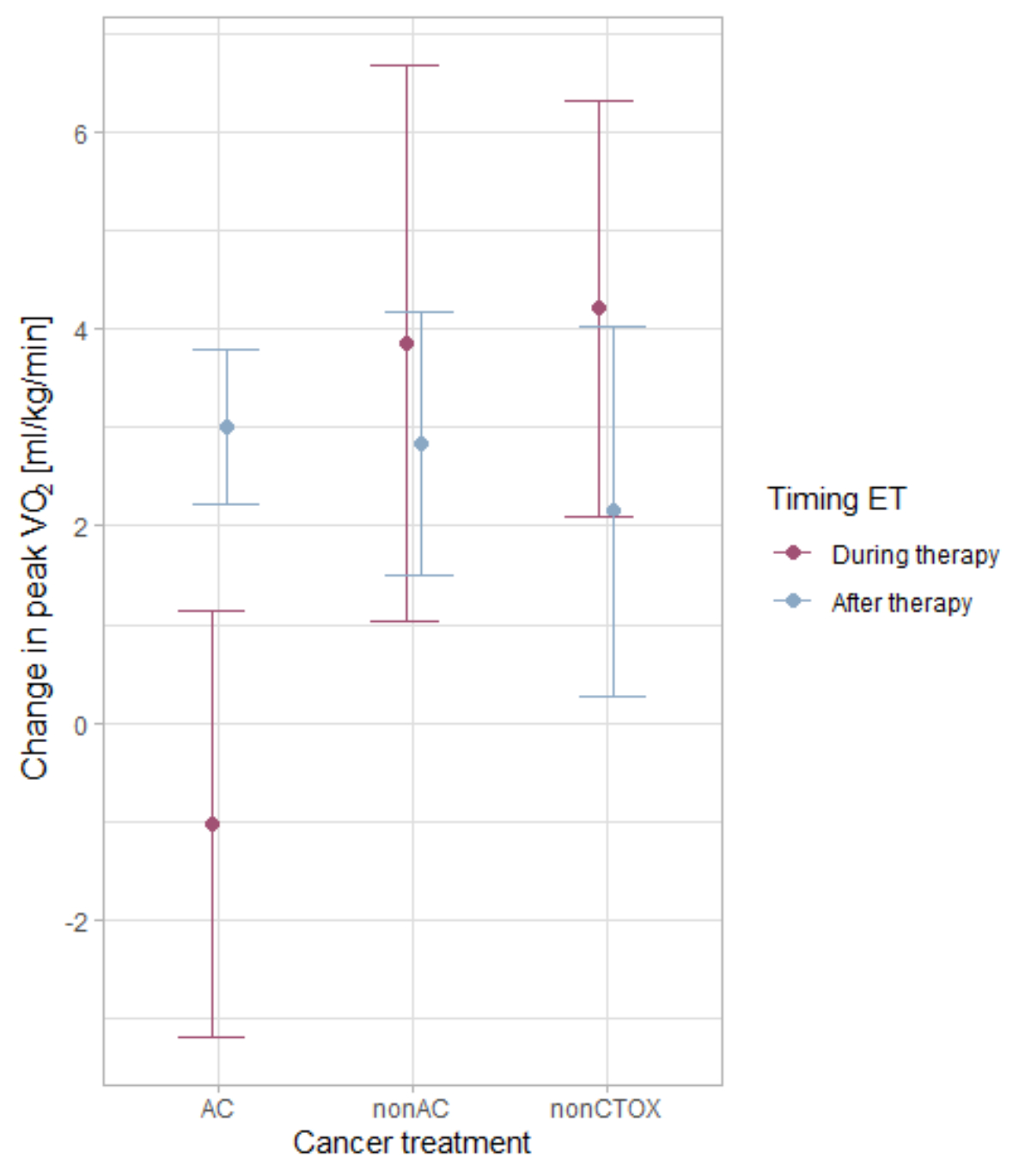 Figure 2Interaction plot showing changes in peak oxygen uptake (VO2) depending on timing of exercise training (ET) and cancer treatment adjusted for age, change in body fat percentage, baseline peak VO2 and training impulse. AC: anthracycline treatment; Non-AC: cardiotoxic treatment other than AC; Non-CTOX: non-cardiotoxic cancer treatment.
