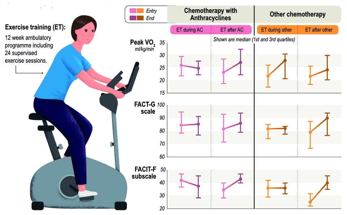 The primary outcome of the study was change in cardiorespiratory fitness (peak VO2) from before to after CORE according to type of therapy, namely anthracycline-based chemotherapy, other cardiotoxic therapies (non-anthracycline) and non-cardiotoxic therapies and timing of exercise training. As secondary outcomes, the study evaluated the association of timing of exercise training with changes in quality of life and cancer-related fatigue in patients with anthracyclines, non-anthracyclines or non-cardiotoxic therapies.