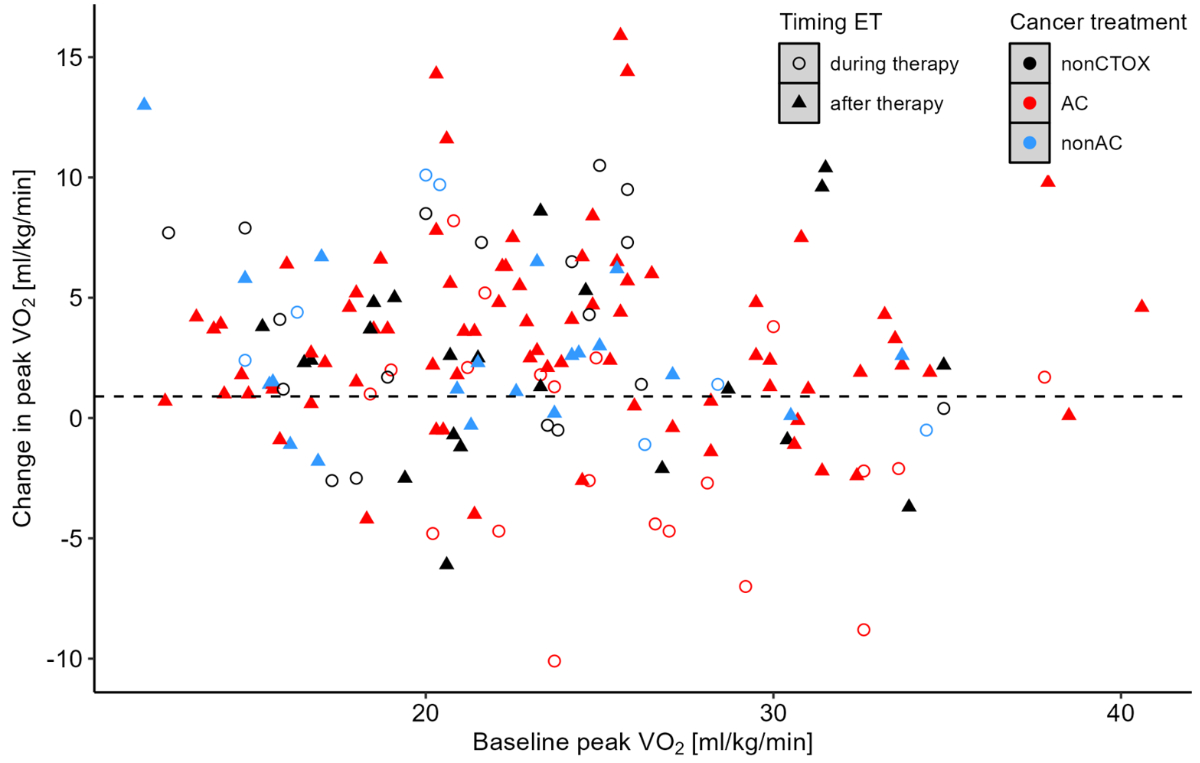 Figure S1Changes in peak VO2 from before to after exercise training (ET) relative to peak oxygen uptake (VO2) at baseline, depending on timing of exercise training and cancer treatment. AC: anthracycline treatment; Non-AC: Cardiotoxic treatment other than AC; Non-CTOX: Non-cardiotoxic cancer treatment.