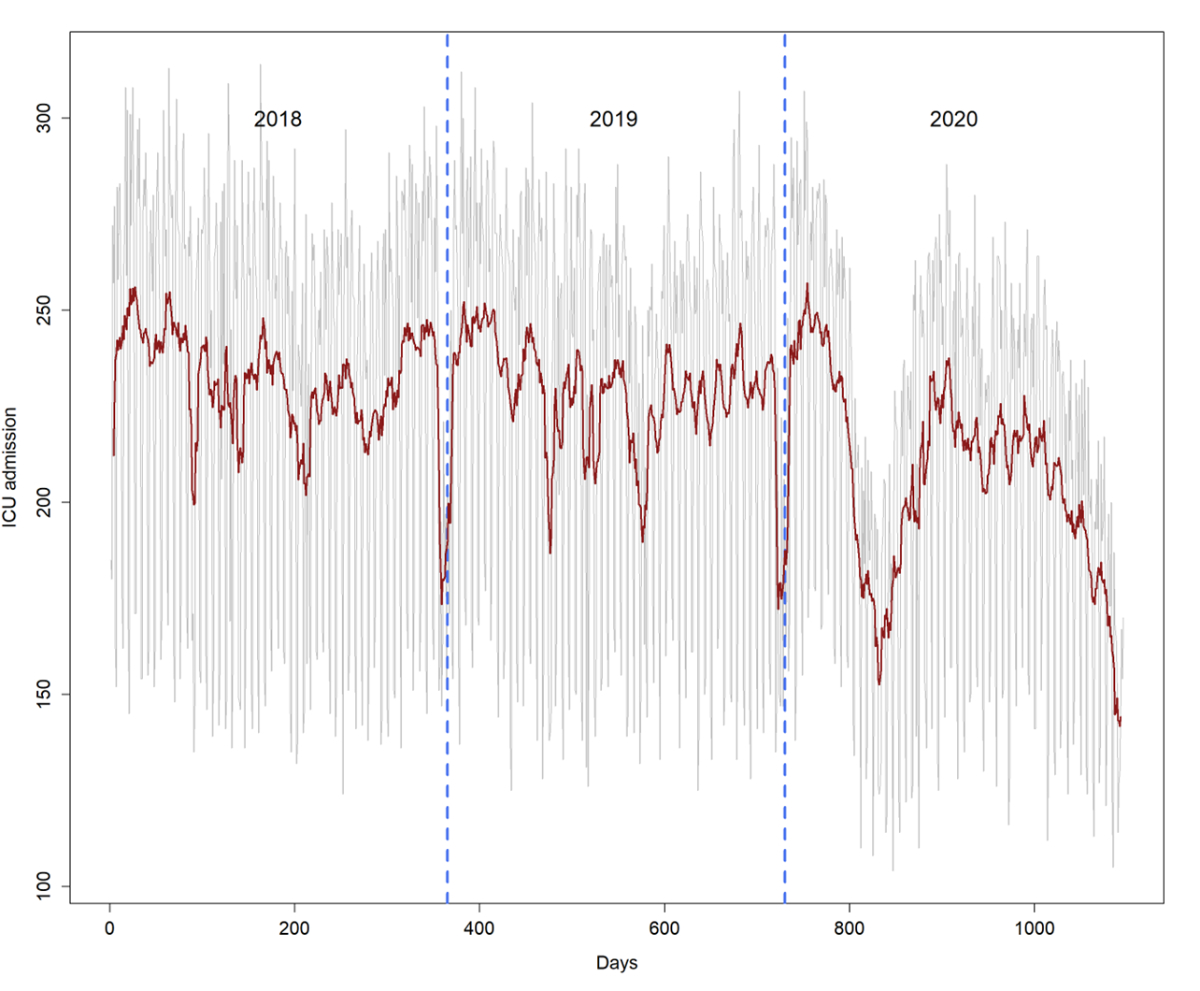 Figure 1Number of daily intensive care unit (ICU) admissions (grey) and its weekly moving average (red) during the study period. The dashed vertical blue lines indicate the calendar year changes. The usual net decrease in hospitalisations during the Christmas holidays (also recognisable during the weeks after Easter and Whitsun) was followed in 2020 by a massive drop during the two COVID-19 waves.