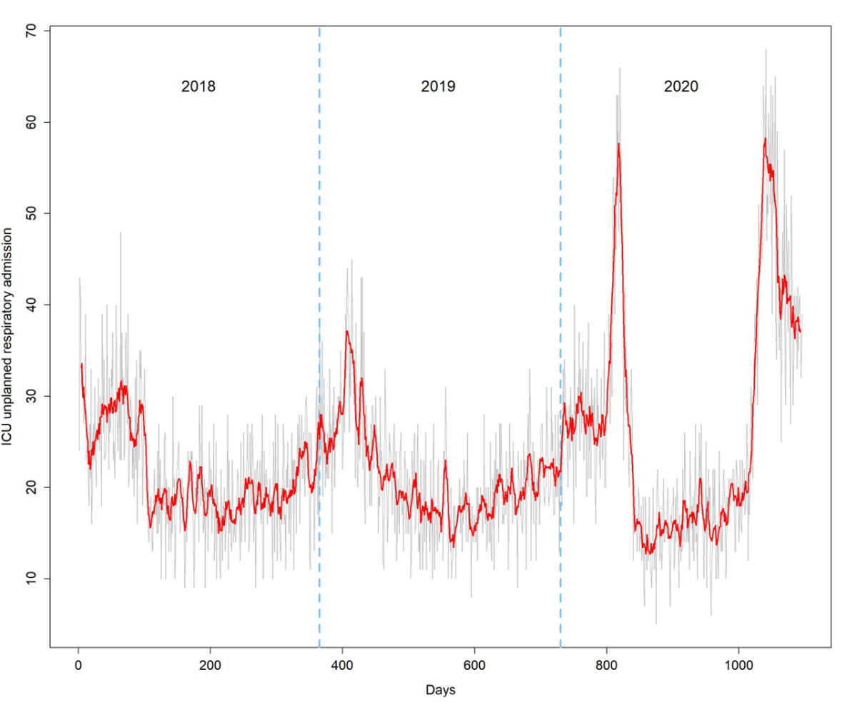 Figure 2Figure 2: Daily unplanned ICU admissions with a respiratory diagnosis (grey) and its weekly moving average (red) during the study period. The dashed vertical blue lines indicate the calendar year changes.