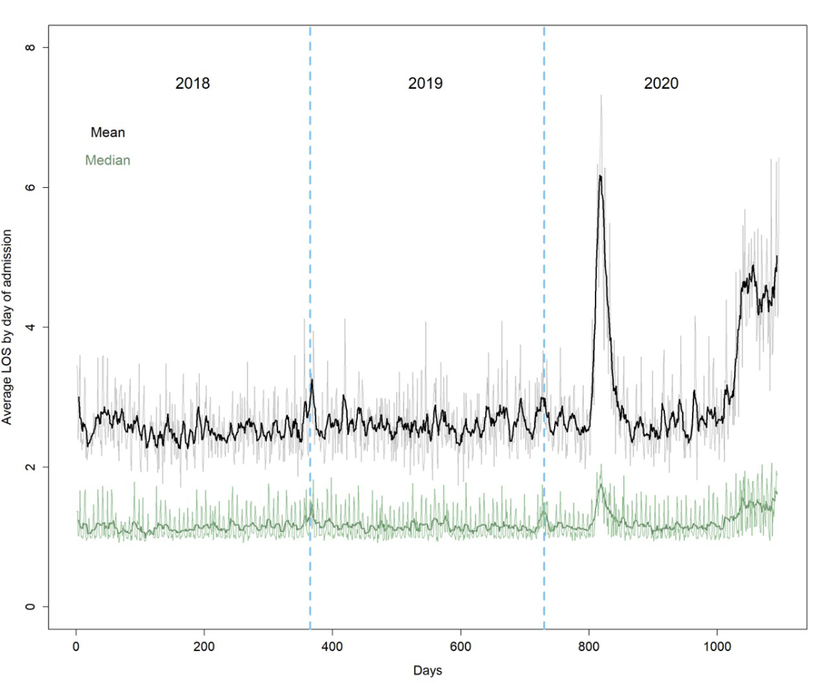 Figure 3Mean (black) and median (dark green) length of stay (LOS) by day of admission and its weekly moving average (bold lines). The dashed vertical blue lines indicate the calendar year changes.