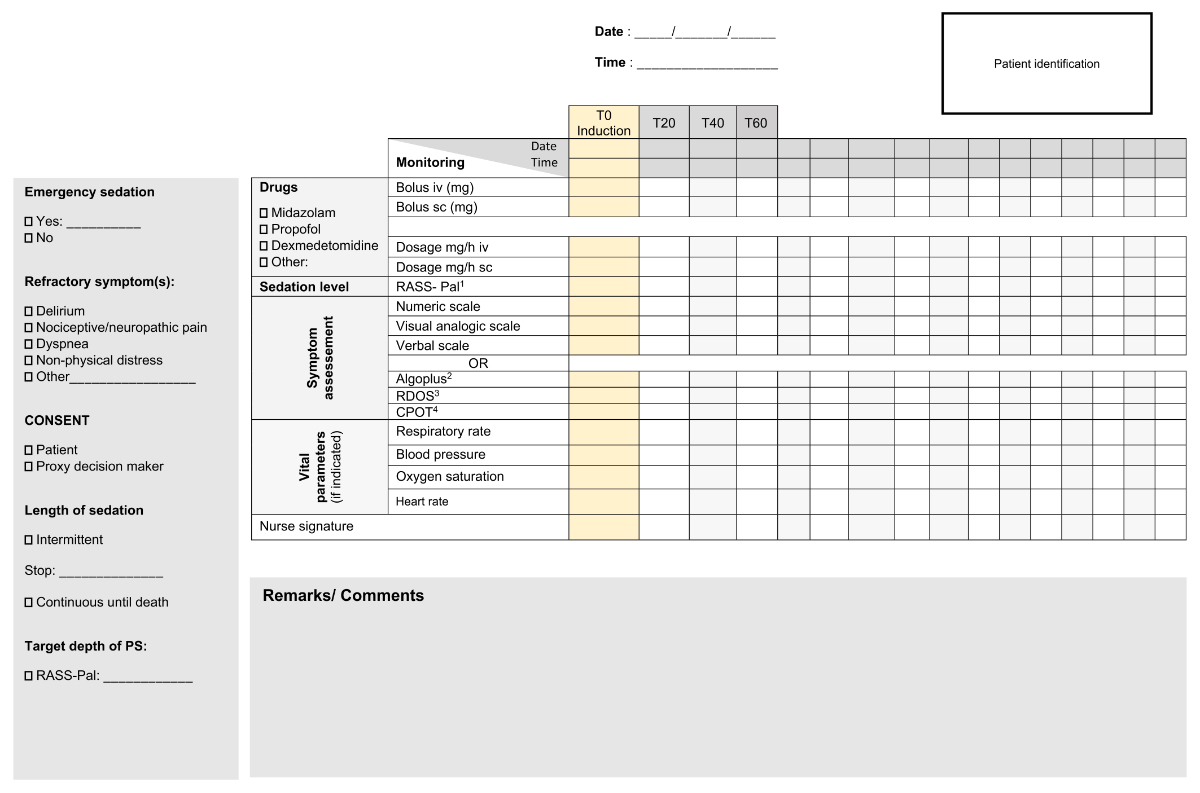 We strongly recommend documenting the conduct and monitoring of palliative sedation using a written/electronic monitoring protocol [6]. After administration of an initial bolus of the chosen sedative, the patient should be assessed continuously at the bedside by a skilled physician or nurse until the maximum drug effect is achieved according to the chosen administration route and the drug’s pharmacokinetics (i.e. 60 minutes for SC midazolam and dexmedetomidine). Thereafter, the patient should be monitored at least once every 20 minutes until their symptoms are relieved and then at least once daily to ensure adequate sedation levels.