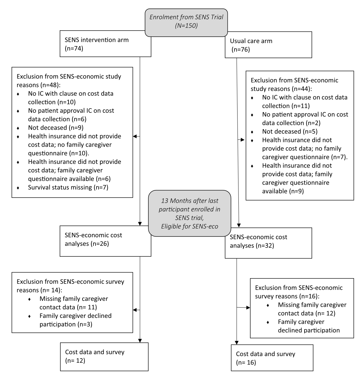 For the SENS-economic study, additional inclusion criteria required participants to have approved the use of their health insurance data in a separate clause in the informed consent and to have died by the end of the study. We considered eligible patients to be completely or partially lost to follow-up if we could not contact family caregivers, family caregivers did not reply or health insurance schemes refused to provide patient cost data. For pragmatic reasons, we began the SENS-economic study after the first 21 participants enrolled in the SENS trial.