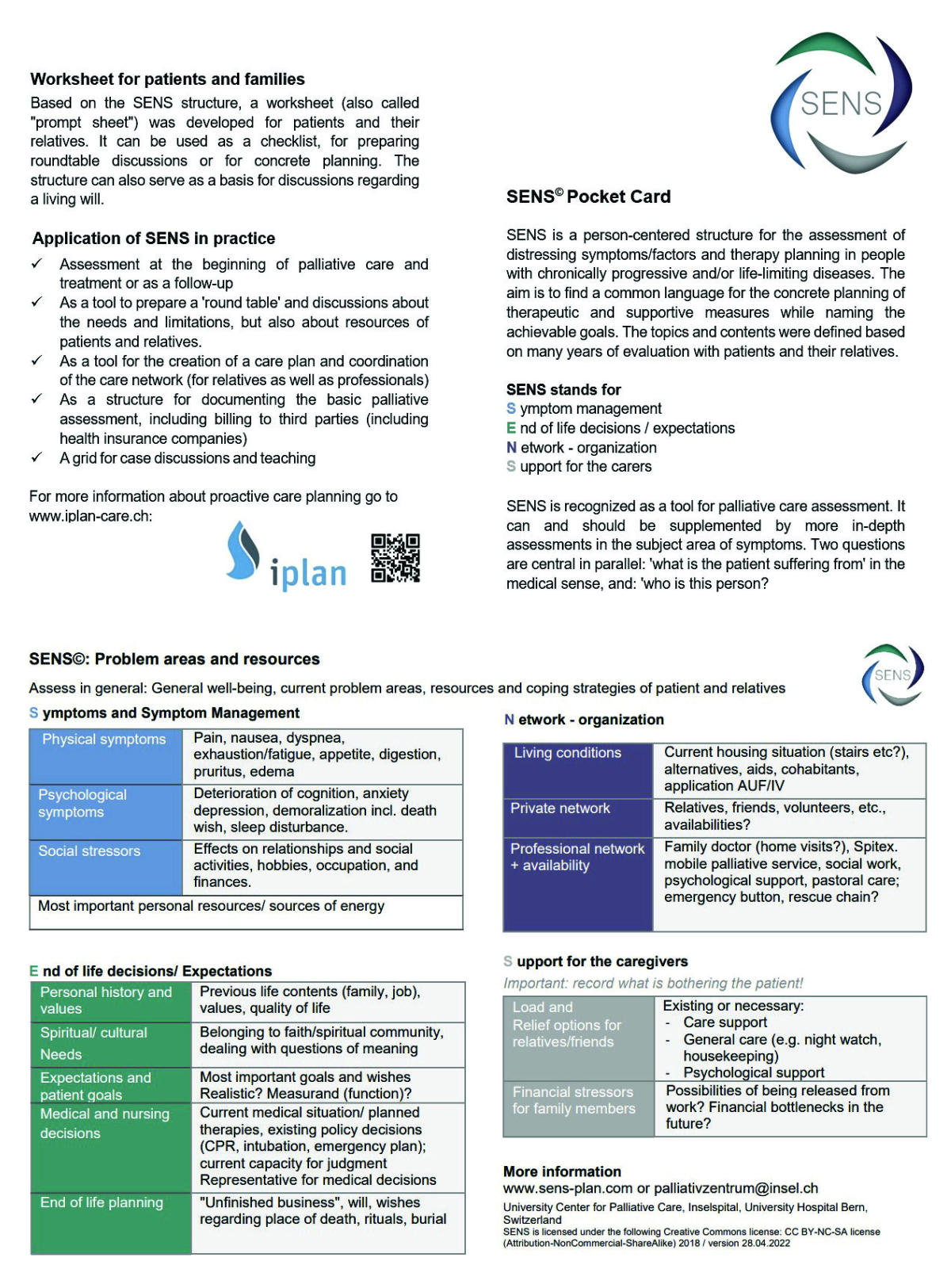The SENS trial was a multicentre RCT on SENS, an early palliative care intervention. SENS is a practice-orientated, thematic intervention structure for assessing, planning and evaluating the treatment of chronic progressive or potentially life-limiting diseases used at any stage requiring palliative support. The SENS trial examined the effects of a single, in-hospital conversational palliative care intervention among patients with advanced cancer. SENS topics include Symptoms, End-of-life decisions, Network building and Support for carers. Details of the SENS trial are published elsewhere [11, 12] (NCT01983956 on www.clinicaltrials.gov). Figure S1 in the appendix shows the SENS intervention structure.
