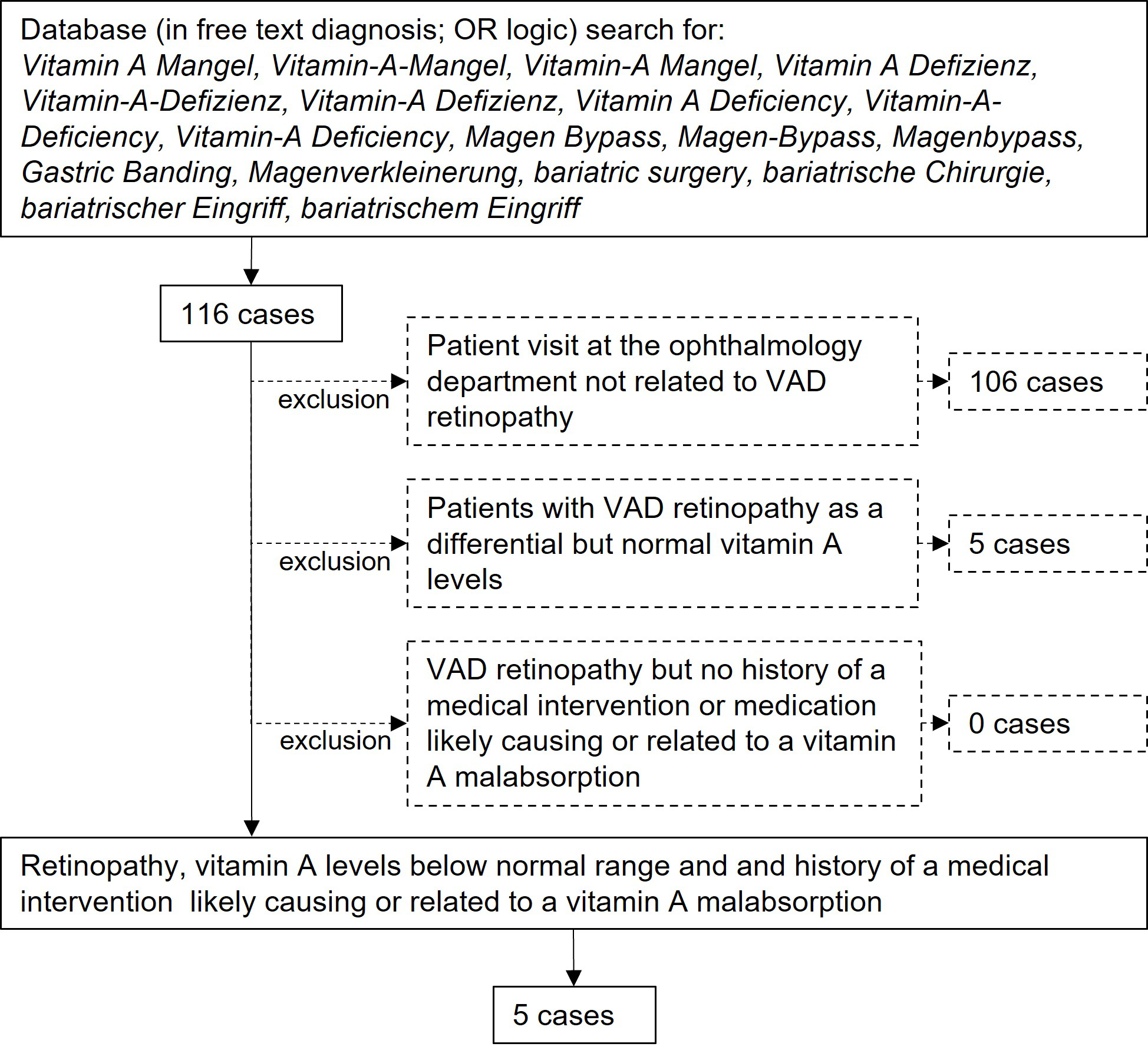 For this single-centre retrospective case study the electronic health records of the Department of Ophthalmology at the University Hospital of Zurich were used as a database. All authors have access to these electronic health records by virtue of their employment at the Department of Ophthalmology. The clinic information system used at the department (KISIM, CISTEC AG, Zurich, Switzerland) has an integrated algorithm for keyword searches, operable only by designated staff after approval from the hospital’s data governance board. For this study, only records of patients who had previously provided informed general consent for further use of their data for research purposes were searched. The records between January 2012 and April 2022 were electronically screened for keywords including vitamin A deficiency as well as bariatric surgery or variations thereof (see figure 1 for detailed list). The search was performed on the free texts of the record entries in the designated field for diagnosis using OR (not exclusive) logic. This search strategy results in positive hits in case of negation, such as “no vitamin A deficiency”, but misses cases with misspelled diagnoses. Only the first positive hit per patient was returned to avoid duplication. The resulting records of this search were then manually screened by a physician for a true diagnosis of vitamin A deficiency retinopathy, especially by abnormalities in the outer retinal layers as detected by retinal imaging and abnormal electrophysiologic examination. Only cases with laboratory-confirmed vitamin A levels below normal (lower limit of the normal range is 0.30 mg/l at our laboratory) and history of a medical intervention likely causing or related to vitamin A malabsorption were included. Symptoms, duration of symptoms, visual acuity, and vitamin A levels were recorded. Results of optical coherence tomography, fundus autofluorescence, electroretinograms, and dark adaptation tests were reviewed if available. Electroretinograms were performed according to the International Society for Electrophysiology of Vision (ISCEV) guidelines valid at the respective time [26, 27]. Further relevant medical history, especially history of bariatric surgery, liver disease, or specific medication known for hindering fat-soluble vitamin uptake, was noted, including the time between any intervention and diagnosis of vitamin A deficiency retinopathy.