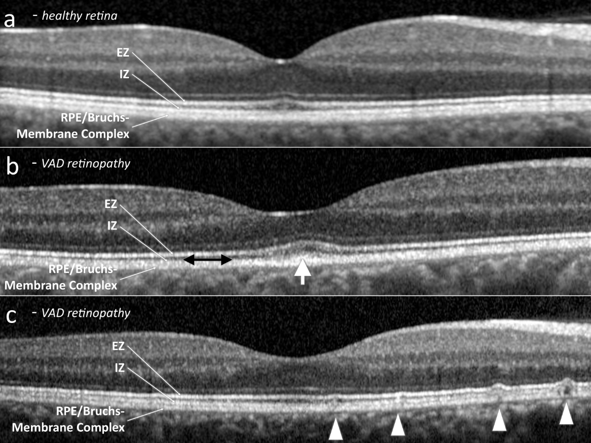21. Jevnikar K, Šuštar M, Kozjek NR, Štrucl AM, Markelj Š, Hawlina M, et al. Disruption of the outer segments of the photoreceptors on optical coherence tomography as a feature of vitamin A deficiency. Retin Cases Brief Rep. 2022 Sep;16(5):658–62. 10.1097/ICB.0000000000001060