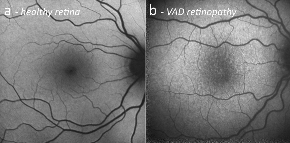 The typical manifestation of vitamin A deficiency retinopathy is night blindness, which is mainly caused by an elevated rod threshold due to reduced rhodopsin levels. This results in reduced dark adaptation [14]. In milder cases, dark adaptation is achieved but as a slower rate [14, 15]. Cones are affected only in very severe and long-lasting vitamin A deficiency [14, 15]. Changes in electrophysiological examinations were described by Arden in 1964 [16]. He noted a diminished electroretinogram response and an abnormal electrooculogram in a patient with vitamin A deficiency who was experiencing night blindness. More recent reports describe the typical electroretinogram findings as reduced or absent rod responses in the presence of preserved light-adapted single flash and reduced 30 Hz flicker responses [17, 18]. Results of retinal imaging are variable, likely depending on the severity and duration of the vitamin A deficiency. Fundus autofluorescence typically indicates various degrees of speckled patches of hypoautofluorescence [19]. Optical coherence tomography can detect abnormal outer retinal foveal hyperreflectivity, disappearance of the interdigitation zone, disruption of the ellipsoid zone, white spots resembling subretinal drusenoid deposits typical of age-related macular degeneration, and thinning of the outer nuclear layer [19–25]. These findings are not specific to vitamin A deficiency retinopathy and exhibit high interindividual variability. Due to the rarity of vitamin A deficiency retinopathy, the fundus autofluorescence and optical coherence tomography findings may be easily missed or attributed to a different retinal pathology.