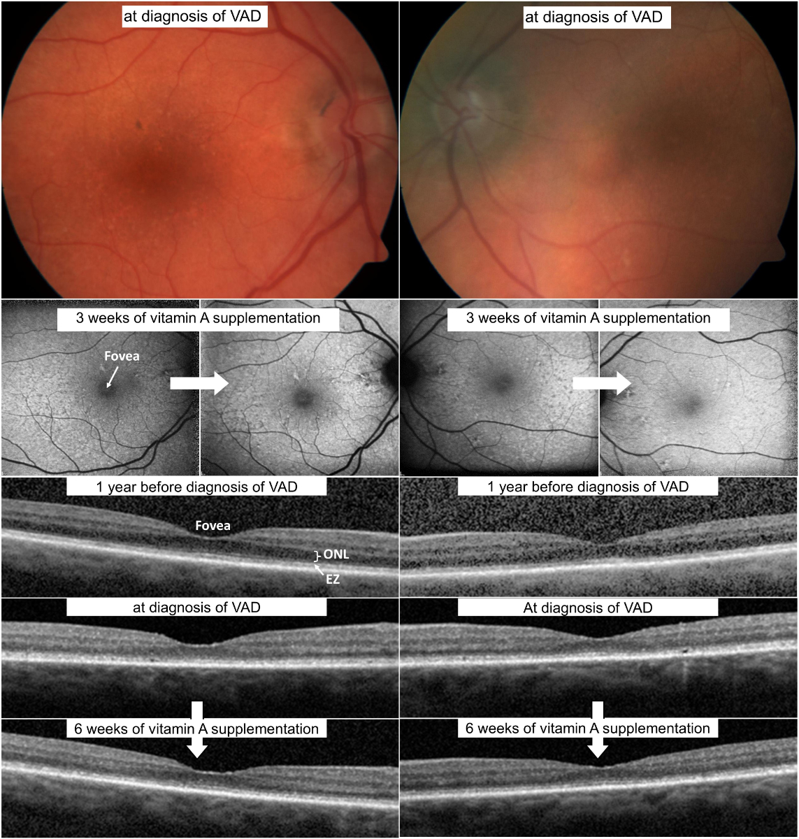 Figure 5Multimodal imaging of patient 1. (a) Fundus photography at time of diagnosis of vitamin A deficiency. Note the numerous round, yellow-white lesions at the posterior pole in both eyes. (b) Fundus autofluorescence at baseline with speckled patches of hypoautofluorescence and some hyperautofluorescence and after vitamin A supplementation, showing a reduction of the speckled patches. (c) Optical coherence tomography one year before diagnosis of vitamin A deficiency, at diagnosis of vitamin A deficiency, and after vitamin A supplementation. Note the thinning of the outer nuclear layer before vitamin A deficiency diagnosis and partial recovery after supplementation. Additionally, an altered ellipsoid zone and interdigitation zone are visible, in addition to subretinal drusenoid deposits, also demonstrating partial recovery after supplementation.EZ: Ellipsoid zone; ONL: Outer nuclear layer.