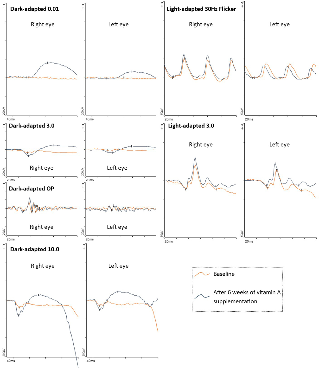 Figure 6Electrophysiological examination of patient 1 at baseline and after vitamin A supplementation. Baseline shows non-recordable rod responses, pseudo-negative mixed rod–cone electroretinogram configurations, and reduced 30 Hz flicker responses. After six weeks of vitamin A supplementation, the electroretinogram showed noticeably improved scotopic responses, including clearly detectable rod responses (dark-adapted 0.01). A pseudo-negative configuration was no longer present. Note: The results of both electroretinogram examinations were asymmetric (right eye > left eye) due to a non-dilating left pupil.ERG: Electroretinogram; OP: Oscillatory potentials.
