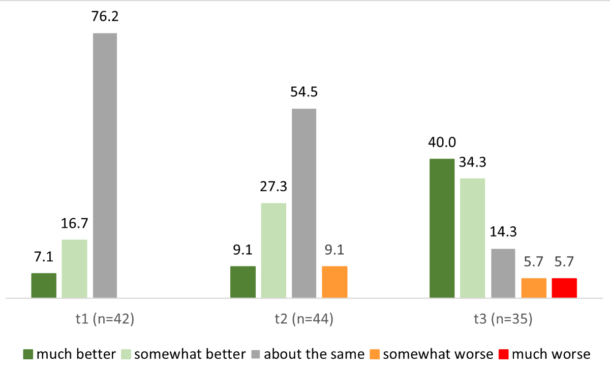 Compared to before the consultation, most participants rated their health as “about the same” at t1 (76.2% or 32/42) and at t2 (54.5% or 24/44). At t3, more patients rated their condition as “much better” (40.0% or 14/35) or “somewhat better” (34.3% or 12/35) (figure 1).