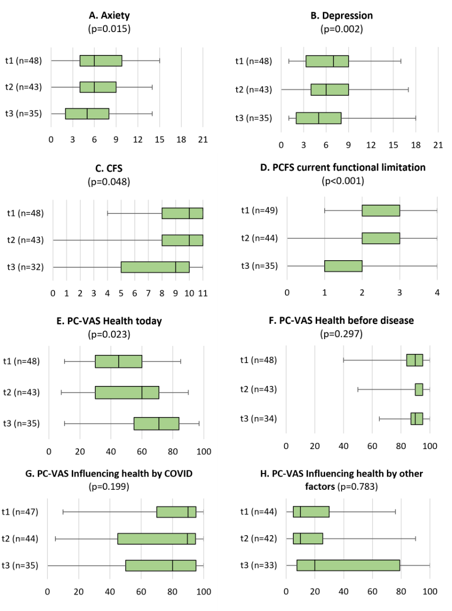Four standardised questionnaires showed statistically significant changes over time: HADS Anxiety (p = 0.015), HADS Depression (p = 0.002), CFS (p = 0.048) and PCFS (p <0.001) (figure 2). The PC-VAS showed significant improvement on the subscale “health today” (p = 0.023). At t3, 77.1% (27/35) had noticeable fatigue symptoms (CFS ≥4), compared to 96.0% (48/50) at t1. The degree of restriction due to COVID symptoms, represented by the PCFS, decreased from a mean of 2.6 ± 0.7 to 1.7 ± 1.0 (p <0.05, appendix table S3).